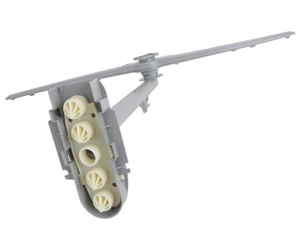 Le bras de lavage ou moulinet est une pièce en plastique ou en inox, composée de petits orifices. Il y en a généralement 2 dans le lave-vaisselle. Un bras inférieur pour le lavage du panier du bas, et un bras de lavage supérieur fixé sous le panier du haut. Ils sont alimentés en eau par la pompe de cyclage via l'arrivée de bras et la came d'alimentation. Par la force de l’eau, ils tournent et aspergent la vaisselle. Il faut vérifier qu'ils ne soient pas bouchés en les nettoyant régulièrement et contrôler qu'il n'y ait pas de jeu excessif ou qu'ils ne soient pas bloqués. Le cas échéant, il convient de les remplacer facilement.