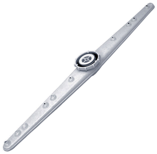 Le bras de lavage ou moulinet est une pièce en plastique ou en inox, composée de petits orifices. Il y en a généralement 2 dans le lave-vaisselle. Un bras inférieur pour le lavage du panier du bas, et un bras de lavage supérieur fixé sous le panier du haut. Ils sont alimentés en eau par la pompe de cyclage. Par la force de l’eau, ils tournent et aspergent la vaisselle.