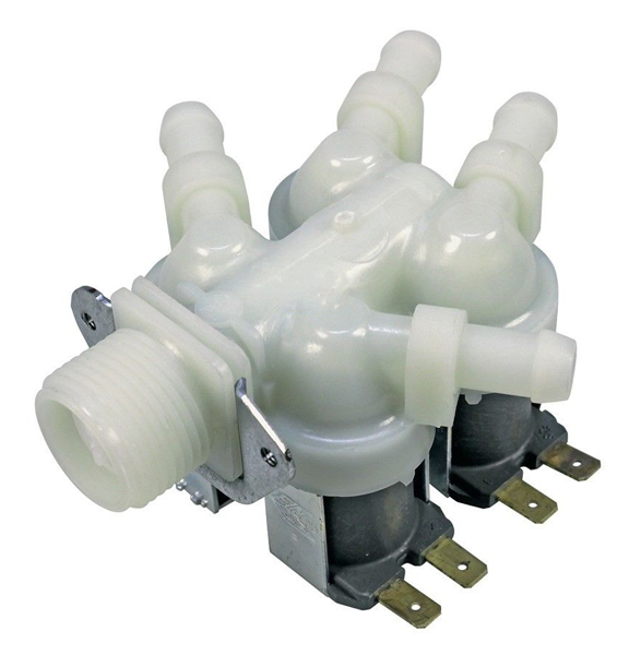 L'électrovanne est la pièce qui permet de contrôler l’arrivée d’eau entrant dans la cuve d’un lave-linge. L’électrovanne est dotée de bobines magnétiques qui, lorsque le cycle de lavage est lancé, permettent à l’eau d'arriver dans la cuve. Lorsque le niveau d’eau est atteint dans la cuve, un capteur envoi un signal à l’électrovanne et coupe l'alimentation électrique.