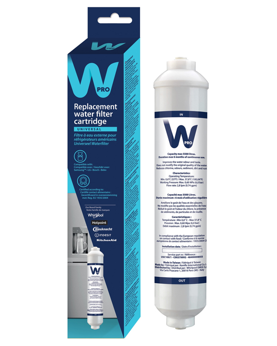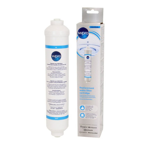 FILTRE A EAU EXTERNE REFRIGERATEUR AMERICAIN WPRO USC100 Dimensions : 26 x 5 cm - Capacité 5670 Litres. Filtre à eau universel externe.