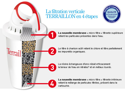 En ce qui concerne les filtres, il en existe plusieurs modèles, certains ont des spécificités particulières mais de manière générale, les nouvelles cartouches Terraillon Easy Filtra+ filtrent le calcaire, le chlore, les pesticides, les métaux lourds et les nitrates.