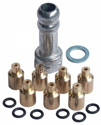 Les injecteurs de gaz sont de petites pièces généralement en laiton ou cuivre de la forme d’une vis 6 pans (6 ou 7 m/m) et percées en leur milieu d'un trou calibré correspondant à la puissance du brûleur.