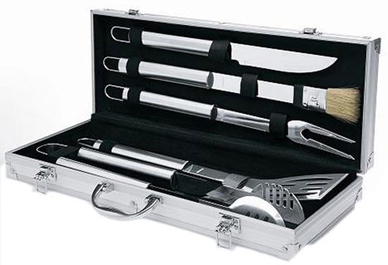 1 Pince - 1 Spatule - 1 Pinceau - 1 Couteau - 1 Fourchette Ce set de luxe contient tous les ustensiles nécessaires pour réussir vos barbecues. Les accessoires sont présentés dans un coffret Inox. Ils peuvent également être suspendus.