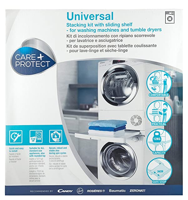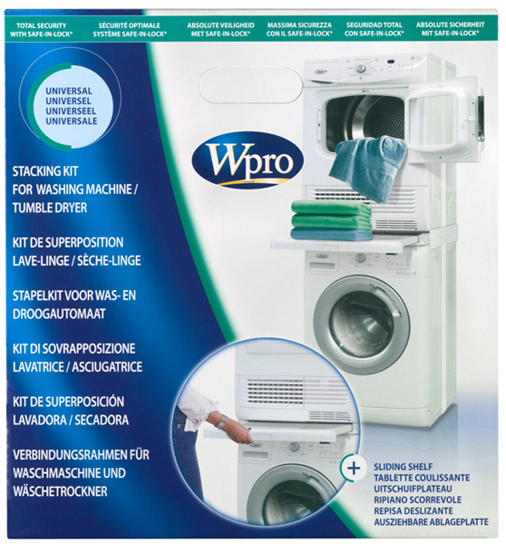 KIT de SUPERPOSITION avec TABLETTE W SKS110 - Stabilise le sèche-linge sur le lave-linge en toute sécurité - S’adapte sur tous les lave-linge et sèche-linge de dimensions 60x60cm - Tablette coulissante offrant un plan de travail supplémentaire - Nouveau système de fixation avec sangle.