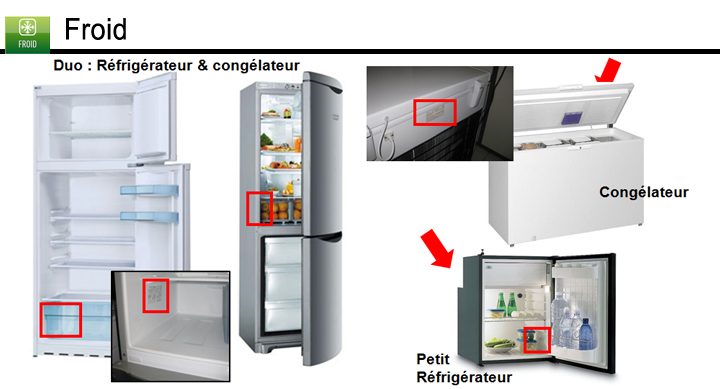 - Réfrigérateurs : à l'intérieur de l'appareil sur le coté gauche au niveau du bac à légumes.