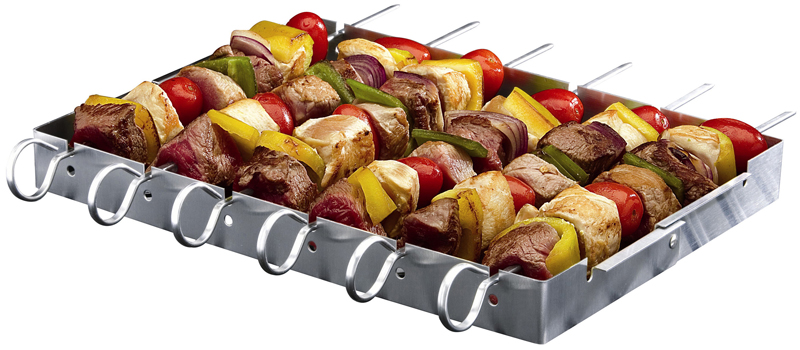 Pratique, cet accessoire facilitera la cuisson de vos brochettes car bien rangées sur le support, elles ne colleront plus et se détacheront facilement. Le support se plie donc facile à ranger. Il est simple à utiliser : placer les brochettes sur le support en les ayant préalablement garnies puis placer le support sur votre grille de barbecue. Support livré avec 6 brochettes. Dimensions du support : 32x25 cm, longueur d'une brochette : 35 cm.