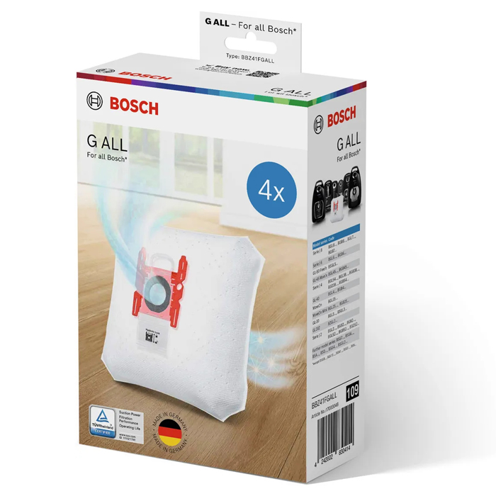 Les nouveaux sacs d'aspirateur BOSCH G ALL offrent une puissance d'aspiration plus élevée et une consommation moindre, même lorsque le sac est plein. Les nouveaux sacs G ALL conviennent à tous les aspirateurs Bosch avec systèmes Typ G La manipulation des changements de sacs est rapide, simple et hygiénique. Assure une plus grande longévité du moteur. Contenu: 4 sacs Aspirateur de Typ. G ALL avec fermeture, 1 filtre Micro-Filtr. Référence commerciale BOSCH BBZ41FGALL