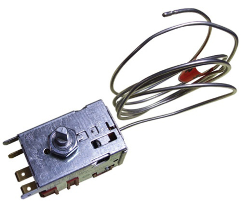 Dans un réfrigérateur ou un congélateur le thermostat vous permet de régler la température de l'appareil et de la maintenir constante. Certains frigos sont contrôlés par une platine électronique. Dans ce cas il y a une sonde de température reliée à cette platine. Le thermostat fonctionne à l’aide d’une sonde parfaitement hermétique. Ce capillaire, logé dans la paroi, permet de prendre la température interne de l’appareil. Ce bulbe contient un gaz sous pression qui réagit selon la température (le gaz se contracte lorsqu'il est refroidi) et est relié à une membrane déformable à son extrémité. L'action du thermostat varie en fonction de la température interne de l'appareil : Lorsque la température monte à l'intérieur du frigidaire, le contact électrique interne du thermostat se ferme pour mettre en fonctionnement le compresseur jusqu'à obtention de la température désirée. Dès que la température programmée dans le réfrigérateur est atteinte, le volume du gaz à l'intérieur du bulbe diminue provoquant l'ouverture du contact, ce qui arrête l’alimentation du compresseur. Si le thermostat de votre frigidaire est défectueux, votre réfrigérateur ne refroidit pas assez ou refroidit trop alors que le sélecteur de température est sur la bonne position ou le moteur / compresseur ne se met pas en route.