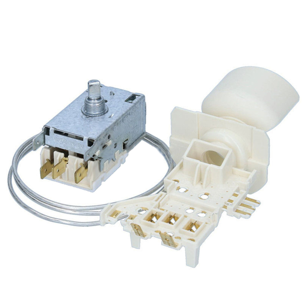 Dans un réfrigérateur ou un congélateur le thermostat vous permet de régler la température de l'appareil et de la maintenir constante. Certains frigos sont contrôlés par une platine électronique. Dans ce cas il y a une sonde de température reliée à cette platine. Le thermostat fonctionne à l’aide d’une sonde parfaitement hermétique. Ce capillaire, logé dans la paroi, permet de prendre la température interne de l’appareil. Ce bulbe contient un gaz sous pression qui réagit selon la température (le gaz se contracte lorsqu'il est refroidi) et est relié à une membrane déformable à son extrémité. L'action du thermostat varie en fonction de la température interne de l'appareil : Lorsque la température monte à l'intérieur du frigidaire, le contact électrique interne du thermostat se ferme pour mettre en fonctionnement le compresseur jusqu'à obtention de la température désirée. Dès que la température programmée dans le réfrigérateur est atteinte, le volume du gaz à l'intérieur du bulbe diminue provoquant l'ouverture du contact, ce qui arrête l’alimentation du compresseur. Si le thermostat de votre frigidaire est défectueux, votre réfrigérateur ne refroidit pas assez ou refroidit trop alors que le sélecteur de température est sur la bonne position ou le moteur / compresseur ne se met pas en route.