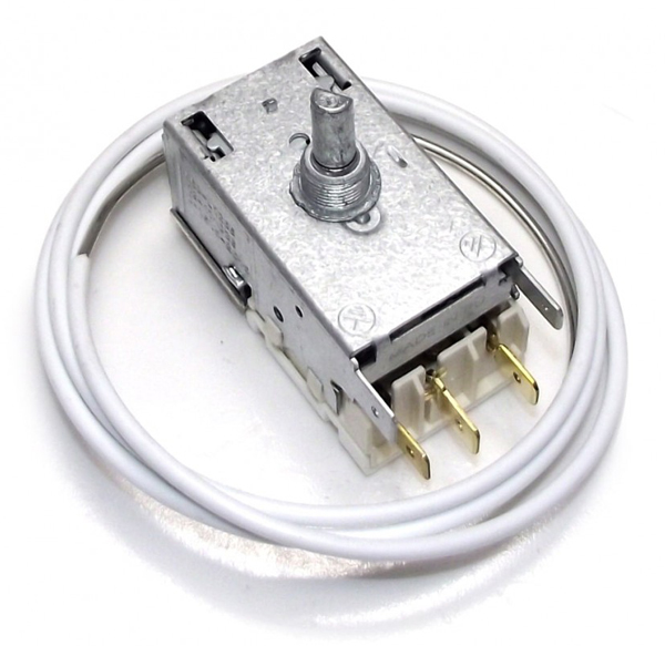 Dans un réfrigérateur ou un congélateur le thermostat vous permet de régler la température de l'appareil et de la maintenir constante. Certains frigos sont contrôlés par une platine électronique. Dans ce cas il y a une sonde de température reliée à cette platine. Le thermostat fonctionne à l’aide d’une sonde parfaitement hermétique. Ce capillaire, logé dans la paroi, permet de prendre la température interne de l’appareil. Ce bulbe contient un gaz sous pression qui réagit selon la température (le gaz se contracte lorsqu'il est refroidi) et est relié à une membrane déformable à son extrémité. L'action du thermostat varie en fonction de la température interne de l'appareil : Lorsque la température monte à l'intérieur du frigidaire, le contact électrique interne du thermostat se ferme pour mettre en fonctionnement le compresseur jusqu'à obtention de la température désirée. Dès que la température programmée dans le réfrigérateur est atteinte, le volume du gaz à l'intérieur du bulbe diminue provoquant l'ouverture du contact, ce qui arrête l’alimentation du compresseur. Si le thermostat de votre frigidaire est défectueux, votre réfrigérateur ne refroidit pas assez ou refroidit trop alors que le sélecteur de température est sur la bonne position ou le moteur / compresseur ne se met pas en route.