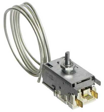 Dans un réfrigérateur ou un congélateur le thermostat vous permet de régler la température de l'appareil et de la maintenir constante. Certains frigos sont contrôlés par une platine électronique. Dans ce cas il y a une sonde de température reliée à cette platine. Le thermostat fonctionne à l’aide d’une sonde parfaitement hermétique. Ce capillaire, logé dans la paroi, permet de prendre la température interne de l’appareil. Ce bulbe contient un gaz sous pression qui réagit selon la température (le gaz se contracte lorsqu'il est refroidi) et est relié à une membrane déformable à son extrémité. L'action du thermostat varie en fonction de la température interne de l'appareil : Lorsque la température monte à l'intérieur du frigidaire, le contact électrique interne du thermostat se ferme pour mettre en fonctionnement le compresseur jusqu'à obtention de la température désirée. Dès que la température programmée dans le réfrigérateur est atteinte, le volume du gaz à l'intérieur du bulbe diminue provoquant l'ouverture du contact, ce qui arrête l’alimentation du compresseur. Si le thermostat de votre frigidaire est défectueux, votre réfrigérateur ne refroidit pas assez ou refroidit trop alors que le sélecteur de température est sur la bonne position ou le moteur / compresseur ne se met pas en route.